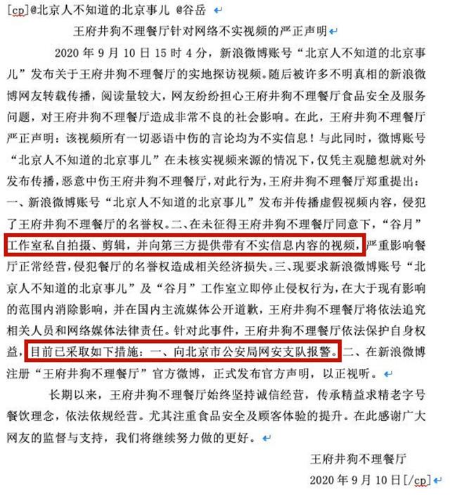 如果僅限于此,事情也沒什么好說的,為了維護(hù)餐廳的名譽(yù),也為了日后的賺錢大計(jì),類似這樣的事件中,餐廳總是會(huì)事先強(qiáng)硬表態(tài),證明自己沒有問題,之后再找機(jī)會(huì)周旋。可狗不理就不一樣了,他直接在聲明中強(qiáng)調(diào):為了維護(hù)自身權(quán)益,已“向北京市公安局網(wǎng)安支隊(duì)報(bào)警”。