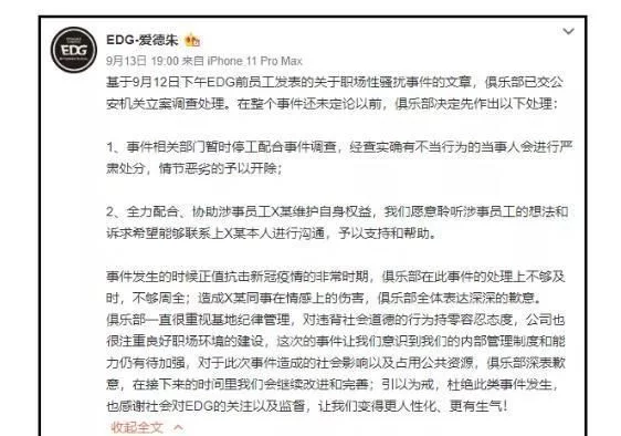 而EDG官博的發(fā)聲再次將群眾的怒火點燃,因為受害者女主在EDG發(fā)布公告之前就已經(jīng)放出了實錘的視頻證據(jù),,而EDG官方這樣的回應(yīng),不得不讓吃瓜群眾們認為EDG的管理層是不是已經(jīng)傻掉了?不僅毫無意義還使得公關(guān)危機更加嚴重,隨后驚動了EDG老板愛德朱出來發(fā)聲,并表示已經(jīng)交給公安機關(guān)處理,對受害者表示歉意并愿意提供合理的支持和幫助。