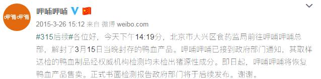 3月16日凌晨4點34分,呷哺呷哺微博發(fā)布第三篇回應(yīng):“3月15日晚,我公司積極配合政府相關(guān)部門的檢查和取樣,提供產(chǎn)品供應(yīng)商的資質(zhì)證明和檢測報告,并按照要求把已經(jīng)下架停售的所有鴨血及時運回總部封存。我們將盡快落實事實,并及時通報。我們就本次事件給消費者帶來的擔(dān)憂和不便致以最誠摯的歉意。 ????”