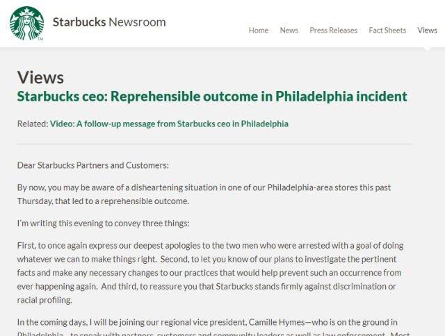最高領(lǐng)導(dǎo)人親臨現(xiàn)場,并頻頻道歉。首席執(zhí)行官凱文·約翰遜在4月16日第一時間飛抵費城向兩名黑人道歉,并和費城的市長見面。