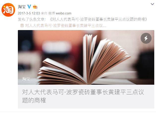 事件發(fā)生在兩會時期,3.15前夕這種敏感時期,淘寶在處理上面稍有不慎則會嚴(yán)重影響企業(yè)的品牌形象。3月5日中午,淘寶在其官方微博、微信發(fā)文《對人大代表馬可·波羅瓷磚董事長黃建平三點議題的商榷》作為回應(yīng)。據(jù)統(tǒng)計,這邊文章獲得200萬+的閱讀量。以下是文章全部內(nèi)容: