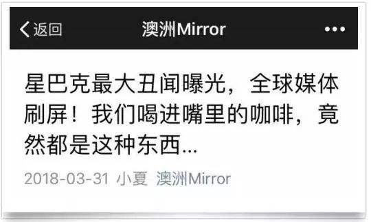 2018年3月29日,一個名為“澳洲Mirror”的公眾號撰寫了一篇文章:《星巴克最大丑聞曝光,全球媒體刷屏!我們喝進嘴里的咖啡,竟然都是這種東西......》。文章中作者宣傳“喝星巴克咖啡致癌,是被隱瞞了8年的真相......”、“美國洛杉磯法院的一紙裁定,可以說是直接判了星巴克的死刑”等等對星巴克不利的內(nèi)容。