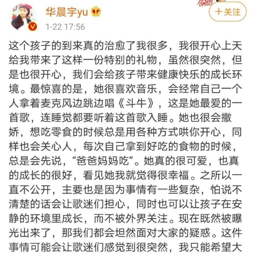 又過(guò)了11分鐘,華晨宇工作人員接最后一棒,告訴大家雙方將在不結(jié)婚的前提下共同撫養(yǎng)孩子。