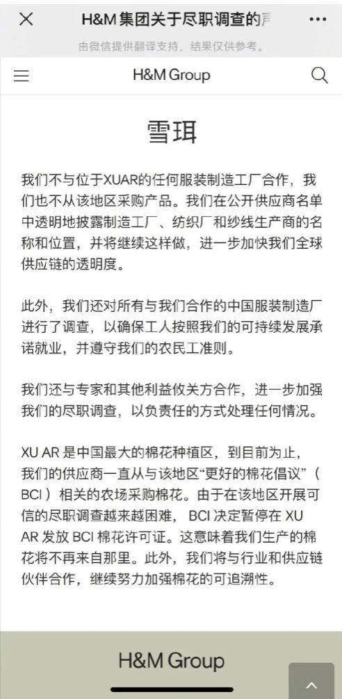 這份聲明寫道:H&M集團(tuán)對來自民間社會組織的報告和媒體的報道深表關(guān)注,其中包括對新疆維吾爾自治區(qū)少數(shù)民族強(qiáng)迫勞動和宗教歧視的指控。(H&M Group is deeply concerned by reports from civil society organisations and media that include accusations of forced labour and discrimination of ethnoreligious minorities in Xinjiang Uyghur Autonomous Region (XUAR).)