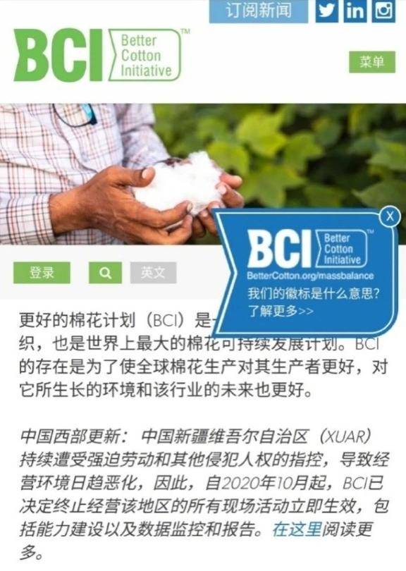 聲明稱,新疆是中國最大的棉花種植區(qū),到目前為止,我們的供應(yīng)商從該地區(qū)與“更好的棉花計劃”(BCI)相關(guān)的農(nóng)場采購棉花。由于在該地區(qū)進(jìn)行可信的盡職調(diào)查變得越來越困難,BCI已決定暫停在新疆發(fā)放BCI棉花許可證。這意味著我們產(chǎn)品所需要的棉花將不再從那里獲得。(XUAR is China’s largest cotton growing area, and up until now, our suppliers have sourced cotton from farms connected to Better Cotton Initiative (BCI) in the region. As it has become increasingly difficult to conduct credible due diligence in the region, BCI has decided to suspend licensing of BCI cotton in XUAR. This means that cotton for our production will no longer be sourced from there. )