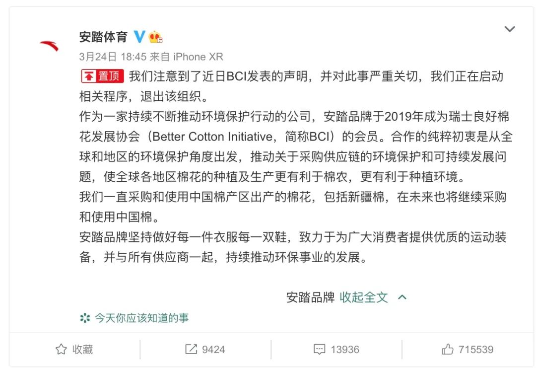 而與此同時,國產(chǎn)品牌品牌安踏則迅速發(fā)布聲明,并宣布退出位于瑞士的良好棉花發(fā)展協(xié)會BCI組織,不得不說這手來得漂亮,時間也拿捏到位,態(tài)度鮮明,很多網(wǎng)友跑到其微博下表態(tài),說以后只買國貨,只穿安踏等等。