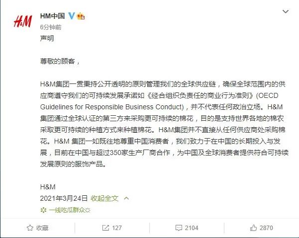配圖中則是H&M集團(tuán)在網(wǎng)站發(fā)布的一份聲明。