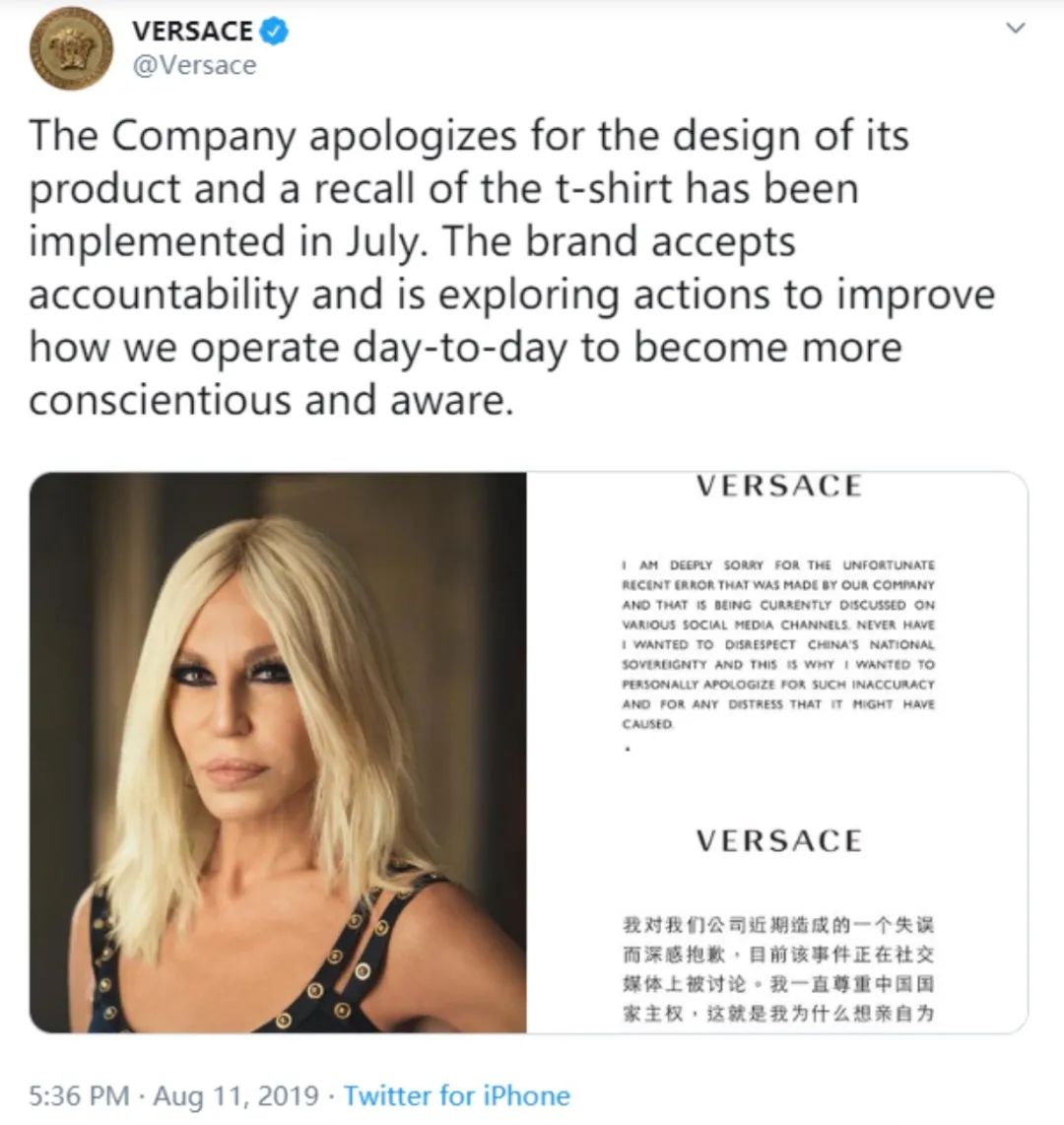 輿論發(fā)酵,網(wǎng)上一片抵制聲,而Versace范思哲緊急致歉,之后還應(yīng)網(wǎng)友強(qiáng)烈要求,在外網(wǎng)以及幾大社交媒體同步以中英文形式公開道歉。