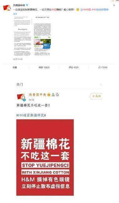 今天,@共青團(tuán)中央 微博發(fā)布的兩條有關(guān)H&M公司#碰瓷新疆棉花#的消息引發(fā)網(wǎng)友廣泛關(guān)注。