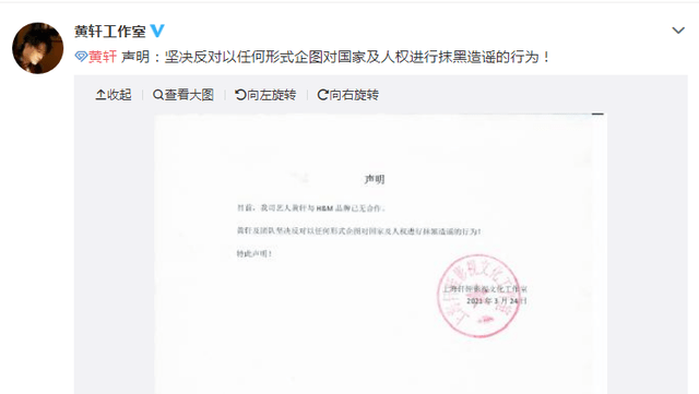 黃軒工作室聲明稱,“我司藝人黃軒與H&M品牌已無合作。黃軒及團(tuán)隊堅決反對任何形式企圖對國家及人權(quán)進(jìn)行抹黑造謠的行為!特此聲明!”
