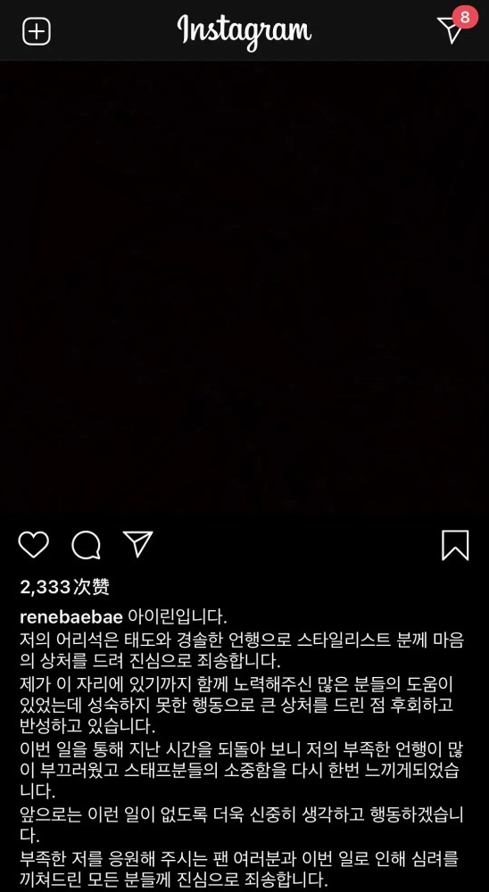 韓國女團red velvet成員irene被曝霸凌化妝師等群體后,有許多粉絲跳出來說irene不是這樣的人,并且po出她和隊友關系很好的動圖洗白。但是sm公司卻立馬下場表態(tài),還讓irene 出來道歉。這件事情隨后迅速熄火,雖然irene的資源也是一落千丈,但最起碼沒有受到太嚴重的打擊,未來復出也還是有希望的。