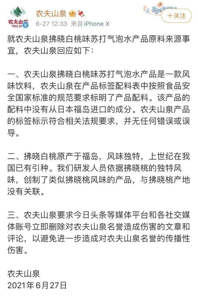 6月26日,農(nóng)夫山泉一款"福島白桃味蘇打氣泡水"引起熱議,該產(chǎn)品宣傳物料中明確打著"原產(chǎn)日本福島縣"的旗號。