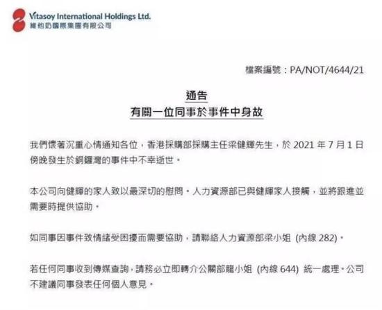 7月2日,維他奶國(guó)際集團(tuán)有限公司在發(fā)布的通告中承認(rèn),襲警男子系維他奶國(guó)際集團(tuán)有限公司香港采購(gòu)部主任梁某。通告稱,梁某為不幸逝世,公司向其家人致以深切慰問。