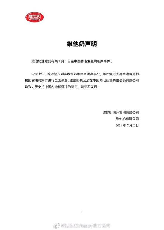 3日凌晨0時(shí)30分,維他奶有限公司官方微博發(fā)表聲明,稱集團(tuán)全力支持香港當(dāng)局根據(jù)國(guó)安法對(duì)案件進(jìn)行全面調(diào)查,維他奶集團(tuán)及在中國(guó)內(nèi)地運(yùn)營(yíng)的維他奶有限公司均致力于支持中國(guó)內(nèi)地和香港的穩(wěn)定、繁榮和發(fā)展。