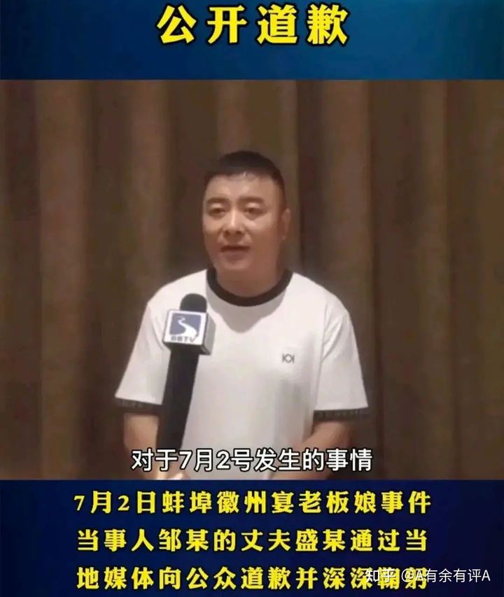 7月6日,蚌埠徽州宴會飲食有限公司法人代表盛祝濤通過媒體,對妻子的言行傷害了對方,給社會帶來的很多負面影響,誠摯道歉。
