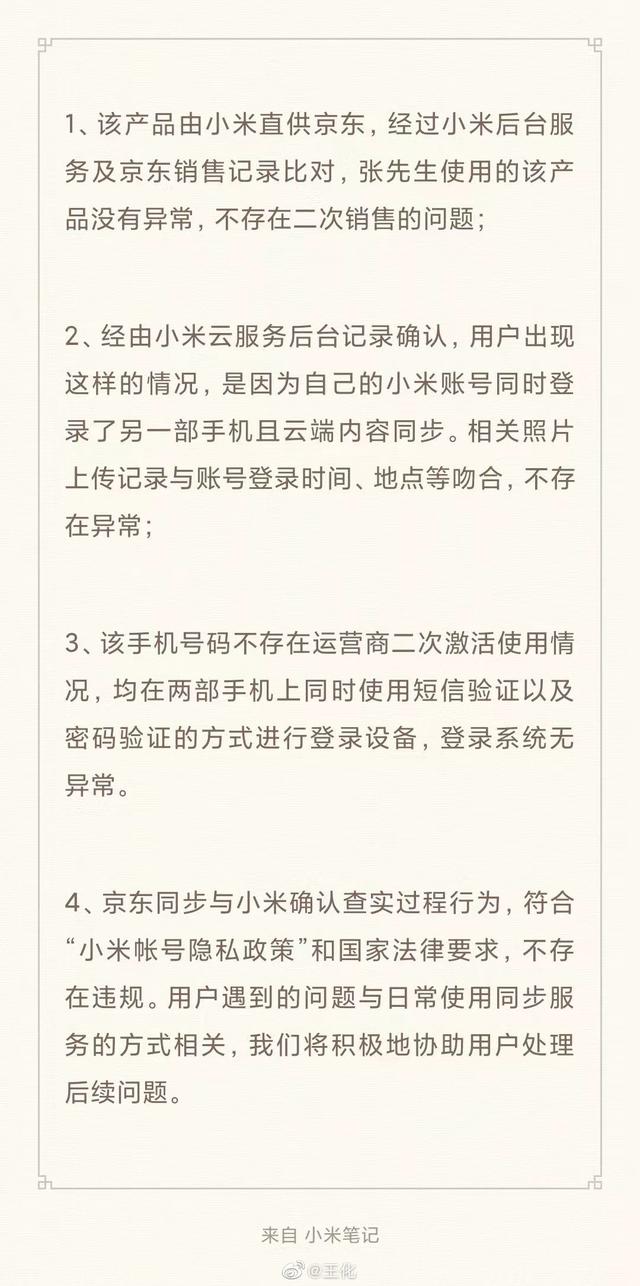 10月21日,小米集團(tuán)公關(guān)部總經(jīng)理王化在其個(gè)人微博就“男子網(wǎng)購(gòu)小米手機(jī)激活后出現(xiàn)他人照片”一事發(fā)表回應(yīng)稱,經(jīng)過(guò)查驗(yàn),該產(chǎn)品由小米直供京東,經(jīng)過(guò)小米后臺(tái)服務(wù)及京東銷售記錄比對(duì),張先生使用的該產(chǎn)品沒(méi)有異常,不存在二次銷售的問(wèn)題。用戶出現(xiàn)這樣的情況,是因?yàn)樽约旱男∶踪~號(hào)同時(shí)登錄了另一部手機(jī)且云端內(nèi)容同步。相關(guān)照片上傳記錄與賬號(hào)登錄時(shí)間、地點(diǎn)等吻合,不存在異常。小米同時(shí)表示,用戶遇到的問(wèn)題與日常使用同步服務(wù)的方式相關(guān),將積極地協(xié)助用戶處理后續(xù)問(wèn)題。