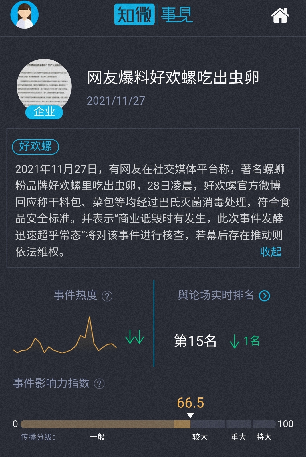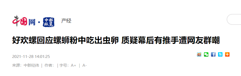 11月28日,好歡螺回應(yīng)“蟲卵”風(fēng)波,卻被輿論質(zhì)疑為“一次失敗的公關(guān)”。此次風(fēng)波起因:11月22日,網(wǎng)友@你是咋居 在社交媒體平臺(tái)稱,著名螺螄粉品牌好歡螺里吃出蟲卵。11月27日凌晨微博大V@八醬日常 轉(zhuǎn)發(fā)相關(guān)內(nèi)容,事件迅速發(fā)酵。知微事見顯示,截至12月1日18時(shí),事件影響力指數(shù)達(dá)66.5,高于77%的企業(yè)類事件。