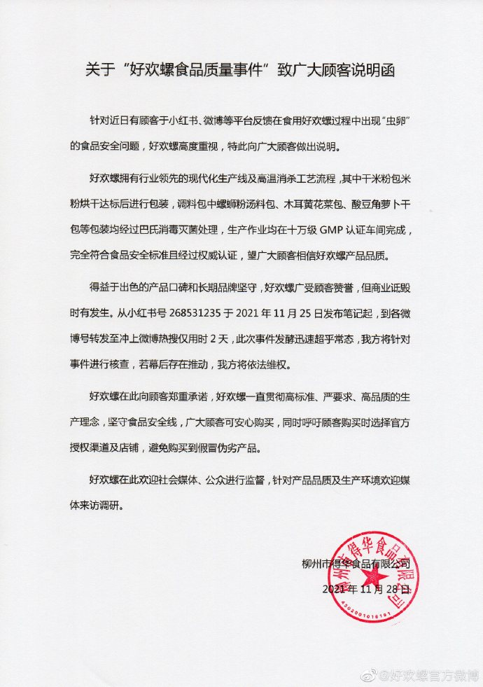 28日凌晨,好歡螺官方微博回應(yīng)稱干料包、菜包等均經(jīng)過巴氏滅菌消毒處理,符合食品安全標(biāo)準(zhǔn),并表示“商業(yè)詆毀時(shí)有發(fā)生,此次事件發(fā)酵迅速超乎常態(tài),將對(duì)該事件進(jìn)行核查,若幕后存在推動(dòng)則依法維權(quán)。”