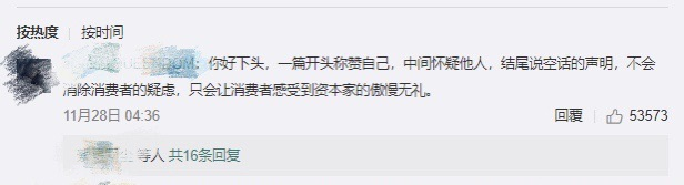 對(duì)于這樣的說明函,網(wǎng)友并不認(rèn)同,進(jìn)而引發(fā)群嘲。官方微博下有人回復(fù)稱“這是一篇開頭稱贊自己,中間懷疑他人,結(jié)尾說空話的聲明,不會(huì)消除消費(fèi)者的疑慮,只會(huì)讓消費(fèi)者感受到資本家的傲慢無禮?!保玫搅?3575的點(diǎn)贊。