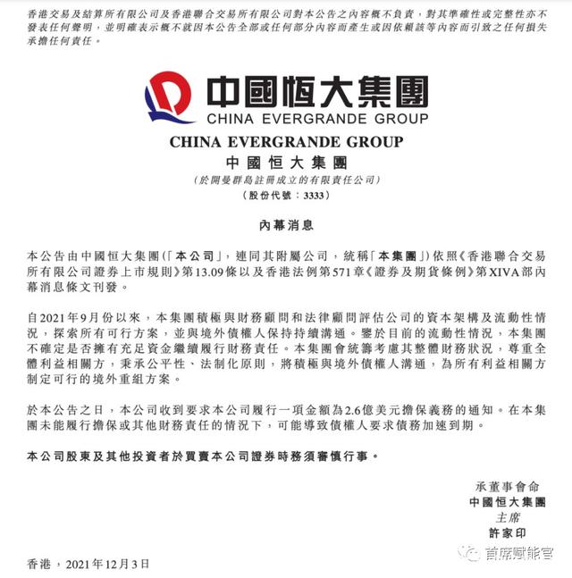 12月3日,中國(guó)恒大集團(tuán)在香港聯(lián)交所發(fā)布了無(wú)法履行擔(dān)保責(zé)任的公告,廣東省人民政府當(dāng)晚立即約談了中國(guó)恒大集團(tuán)實(shí)控人許家印。廣東省人民政府網(wǎng)站當(dāng)日消息顯示,應(yīng)恒大地產(chǎn)集團(tuán)有限公司請(qǐng)求,為有效化解風(fēng)險(xiǎn),保護(hù)各方利益,維護(hù)社會(huì)穩(wěn)定,廣東省人民政府同意向恒大地產(chǎn)集團(tuán)有限公司派出工作組,督促推進(jìn)企業(yè)風(fēng)險(xiǎn)處置工作,督促切實(shí)加強(qiáng)內(nèi)控管理,維護(hù)正常經(jīng)營(yíng)。