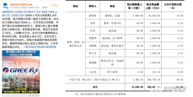 2021年6月20日晚間,格力電器公告第一期員工持股計(jì)劃(草案),顯示股票來(lái)源為回購(gòu)專(zhuān)用賬戶(hù)中已回購(gòu)的股份,員工持股購(gòu)買(mǎi)價(jià)格為27.68元/股(約為公告前一個(gè)交易日格力電器股價(jià)的50%),對(duì)象包括公司董(不含獨(dú)立董事)監(jiān)高,以及公司及控股子公司經(jīng)董事會(huì)認(rèn)定對(duì)公司整體業(yè)績(jī)和中長(zhǎng)期發(fā)展具有重要作用的中層干部和核心員工。