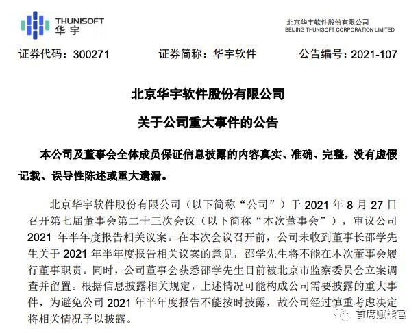 2021年8月29日,華宇軟件發(fā)布公告,2021年3月22日,公司收到北京市監(jiān)察委員會(huì)通知,對(duì)公司實(shí)控人,董事長(zhǎng)、總經(jīng)理邵學(xué)涉嫌行賄的違法問(wèn)題立案調(diào)查,并自2021年3月21日對(duì)其實(shí)施留置。