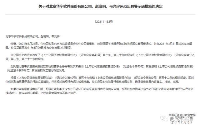 11月16日,北京證監(jiān)局向華宇軟件以及趙曉明、韋光宇出具警示函,認(rèn)定,華宇軟件違反了《上市公司信息披露管理辦法》(證監(jiān)會(huì)令第40號(hào))第二條、第三十條的規(guī)定和《上市公司信息披露管理辦法》(證監(jiān)會(huì)令第182號(hào))第三條、第二十二條的規(guī)定;受托履行董事長(zhǎng)主要職責(zé)的趙曉明和董事會(huì)秘書(shū)韋光宇未按照《上市公司信息披露管理辦法》(證監(jiān)會(huì)令第40號(hào))第三條和《上市公司信息披露管理辦法》(證監(jiān)會(huì)令第182號(hào))第四條的規(guī)定履行相應(yīng)義務(wù)。