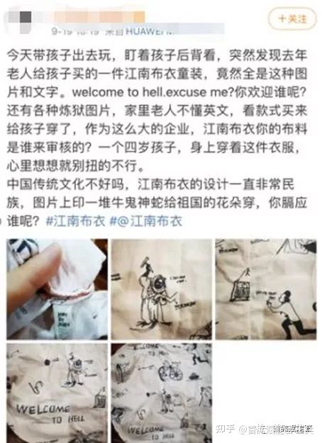 【事件梗概】2021年9月19日,一位網(wǎng)友在社交網(wǎng)站上發(fā)文稱家里的一件“江南布衣”品牌童裝上印滿了“Welcome to hell(歡迎來到地獄)”、“l(fā)et me touch you(讓我摸摸你)”、“I just need a foot(我只要一只腳)”等字樣,以及一些如砍斷腿、煉獄的圖案,引起了部分網(wǎng)友的關(guān)注和討論。一些網(wǎng)友翻出自己之前購買的該品牌童裝,發(fā)現(xiàn)上面也有此類圖案與英文。討論中,有網(wǎng)友指出該品牌此前部分廣告海報風(fēng)格陰森恐怖、含有暴力色情等元素。