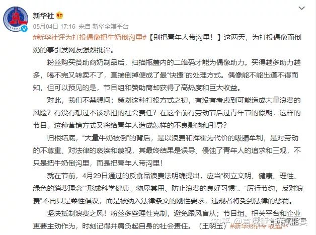 5月4日 新華社發(fā)表評論【別把青年人帶溝里!】指出,“大量牛奶被倒”的背后,是以浪費和揮霍為代價的吸睛牟利,是對勞動的不尊重、對法律的褻瀆和蔑視,是誤導(dǎo)、侵蝕了青年人的追求和三觀,不只是把牛奶倒溝里,而是把青年人帶溝里!當(dāng)天,北京市廣電局,責(zé)令平臺方暫停對《青春有你》第三季的錄制,要求該平臺嚴(yán)格落實廣電行政部門有關(guān)規(guī)定,完善節(jié)目管理制度,認(rèn)真核查并整改存在的問題。次日凌晨,《青春有你》制作組在官方賬號上做出回應(yīng),表示對懲罰堅決服從,誠懇接受,認(rèn)真核查并整改問題,力求更加嚴(yán)格細致地把握節(jié)目制作的每個環(huán)節(jié),積極營造健康的網(wǎng)絡(luò)環(huán)境,感謝社會各界的關(guān)心和督導(dǎo),對出現(xiàn)的問題深表歉意。