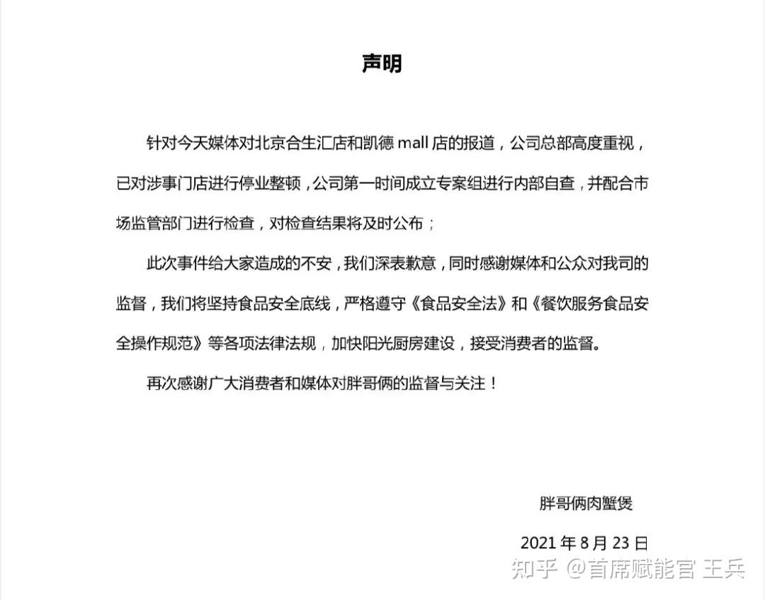 【同類案例】2021年8月23日,同為網(wǎng)紅餐飲品牌的胖哥倆被爆出食品安全問題。據(jù)媒體暗訪調(diào)查發(fā)現(xiàn),胖哥倆標(biāo)榜現(xiàn)宰現(xiàn)殺的螃蟹,卻是前一天沒賣完的螃蟹冷藏后第二天繼續(xù)賣,清洗后的隔夜螃蟹便可以充當(dāng)新鮮螃蟹重新送上顧客的餐桌;包裝袋上標(biāo)識即將過期的土豆,店員在拆封包裝后繼續(xù)被當(dāng)作可以使用的食材。當(dāng)天,胖哥倆官微發(fā)聲明對此進行回應(yīng),稱已對涉事門店進行停業(yè)整頓,公司第一時間成立專案組進行內(nèi)部自查,并配合市場監(jiān)管部門進行檢查,對檢查結(jié)果將及時公布。