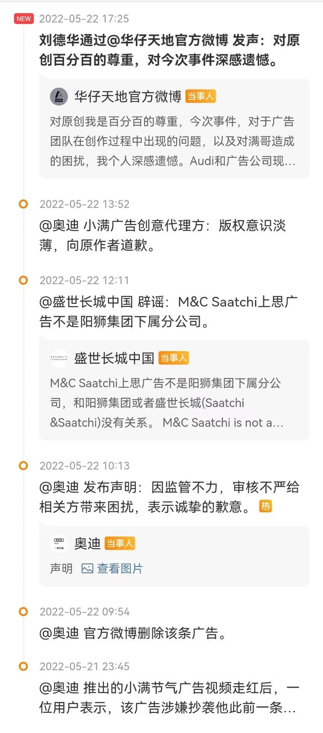2022年5月21日,奧迪一支廣告宣傳片《小滿》被指抄襲,微博詞條#奧迪小滿廣告抄襲閱讀次數(shù)5.6億次,討論次數(shù)達4.6萬。第二天上午,奧迪就刪除該條廣告并發(fā)布致歉,說明事情原委。