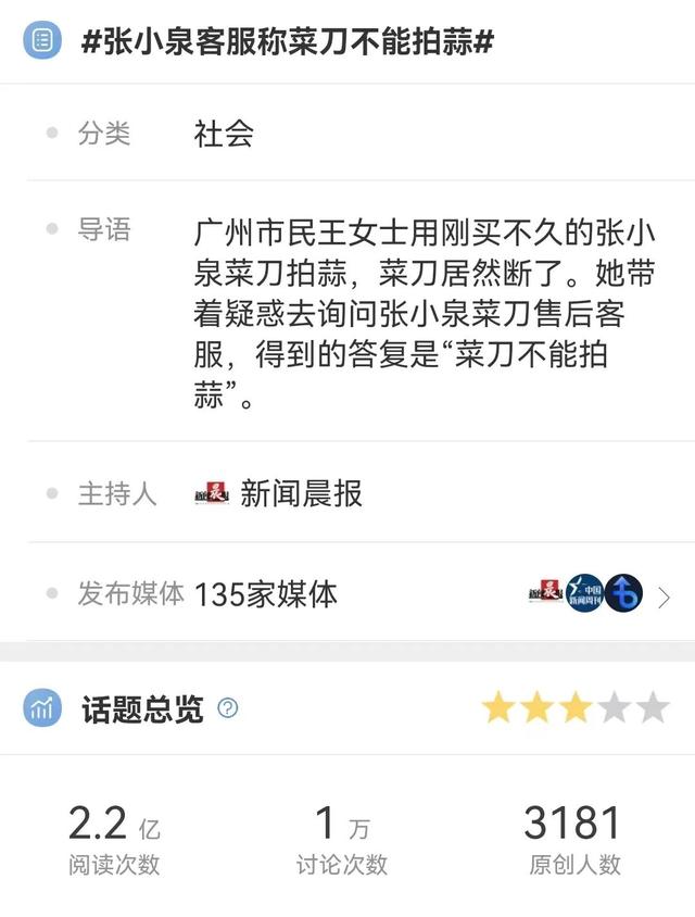 另一方面公眾不是無法理解菜刀的硬度高橫拍容易斷,也并不是一定要抓住一把斷刀不放。在本次事件中,公眾的核心訴求在于品牌方的態(tài)度,希望張小泉給出切實的解決方案,但是很顯然張小泉并沒有意識到這一點。