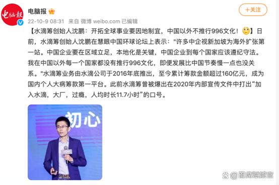 據(jù)媒體報(bào)道,2022年10月8日,水滴籌創(chuàng)辦人沈鵬在慧眼中國環(huán)球論壇上表示:“中國企業(yè)要在區(qū)域立足,本地化是關(guān)鍵,中國企業(yè)到每個國家應(yīng)該遵紀(jì)守法,我在中國以外每一個國家都沒有推行996文化,即便發(fā)展比中國節(jié)奏慢一點(diǎn)也沒關(guān)系?!?/p>
