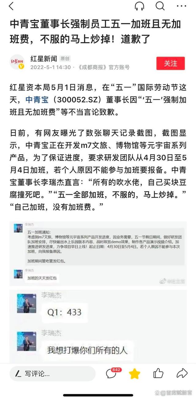 2022年5.1前夕,上市公司中青寶董事長李瑞杰強(qiáng)制要求員工五一假期加班的聊天記錄截圖被曝光。媒體報(bào)道顯示,在公司內(nèi)部群中,中青寶董事長李瑞杰強(qiáng)制要求員工五一假期全部加班,并表示“不服的,馬上炒掉”。不僅如此,其言語中還出現(xiàn)了“我想打爆你們所有的人”、“自己買塊豆腐撞死吧”等內(nèi)容。此事迅速引發(fā)熱議,一度沖上熱搜。
