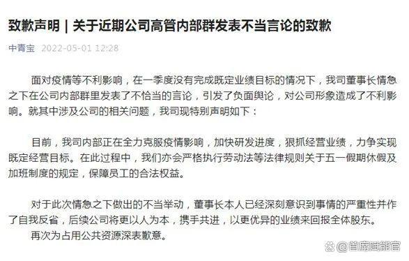 5月1日當(dāng)天,中青寶通過微信公眾號致歉稱,面對疫情等不利影響,在一季度沒有完成既定業(yè)績目標(biāo)的情況下,公司董事長情急之下在公司內(nèi)部群里發(fā)表了不恰當(dāng)?shù)难哉?,引發(fā)了負(fù)面輿論,對公司形象造成了不利影響。并表示,會嚴(yán)格執(zhí)行勞動法等法律規(guī)則關(guān)于“五一”假期休假及加班制度的規(guī)定,保障員工的合法權(quán)益。同時(shí),對于此次情急之下做出的不當(dāng)舉動,董事長本人已經(jīng)深刻意識到事情的嚴(yán)重性并作了自我反省。