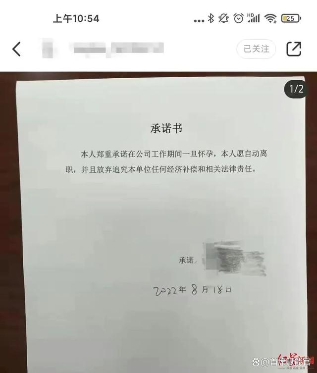 2022年8月28日,一份要求女員工一旦懷孕自動離職的所謂免責(zé)承諾書在社交媒體上曝出。赫然寫著:“本人鄭重承諾在公司工作期間一旦懷孕,本人要自動離職,并且放棄追究本單位任何經(jīng)濟(jì)補(bǔ)償和相關(guān)法律責(zé)任。”輿論為這份所謂的“免責(zé)承諾書”嘩然,紛紛譴責(zé)。