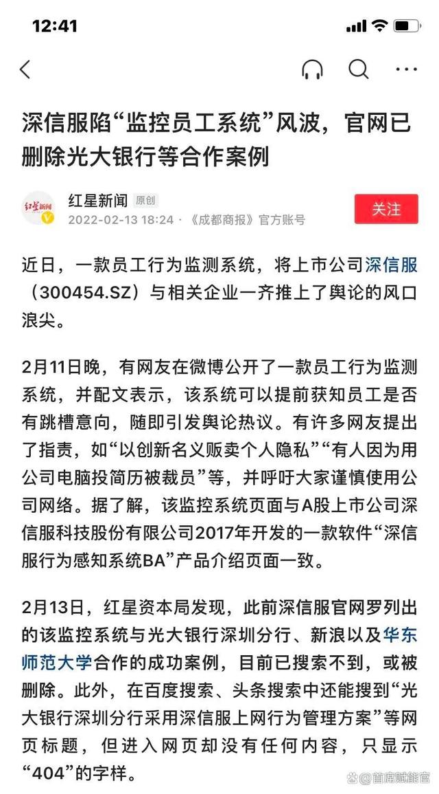 據(jù)每日經(jīng)濟(jì)新聞報(bào)道,2月15日,深信服董秘蔣文光回應(yīng)稱,沒有關(guān)注檢索不到相關(guān)頁面一事,公司的行為感知系統(tǒng)并非最近上市,工作效率分析、離職傾向分析等都是產(chǎn)品的功能,公司并不監(jiān)測個人數(shù)據(jù),這是客戶自己的行為。這位董秘強(qiáng)調(diào),離職傾向分析是深信服產(chǎn)品中一個很小的功能,重點(diǎn)是泄密追蹤分析,幫助政企用戶管理內(nèi)部的一些威脅。并且,這個系統(tǒng)只是監(jiān)測辦公電腦和公司的內(nèi)部網(wǎng)絡(luò),不會在互聯(lián)網(wǎng)上監(jiān)控員工的行為。