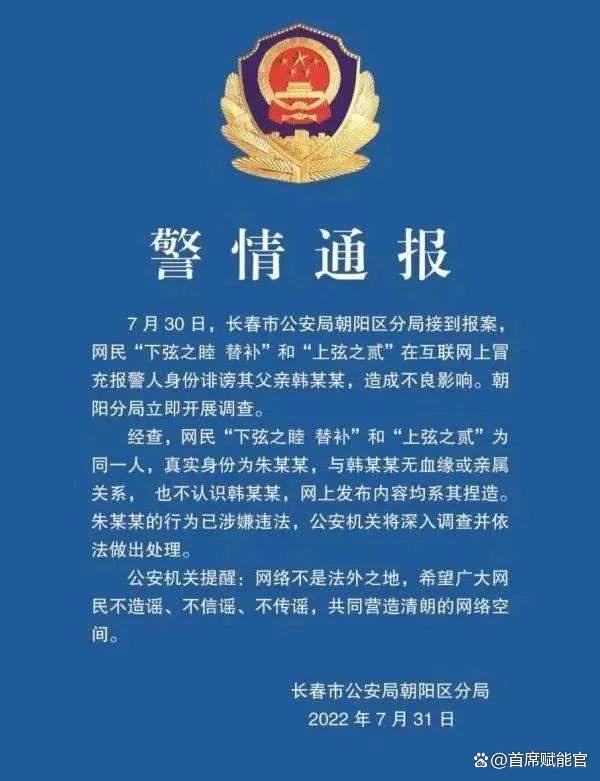 7月31日,長春市公安局朝陽區(qū)分局通報(bào)稱:7月30日,長春市公安局朝陽區(qū)分局接到報(bào)案,網(wǎng)民“下弦之睦替補(bǔ)”和“上弦之貳”在互聯(lián)網(wǎng)上冒充報(bào)警人身份誹謗其父韓某某,造成不良影響。朝陽分局立即開展調(diào)查。