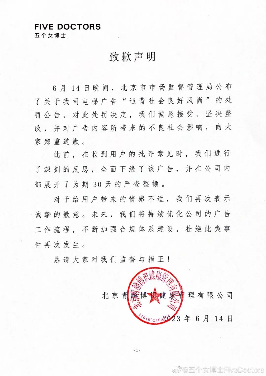 當(dāng)晚,五個女博士品牌在其官方微博上公開發(fā)表致歉聲明,表示“誠懇接受、堅決整改”、“杜絕此類事件再次發(fā)生”。