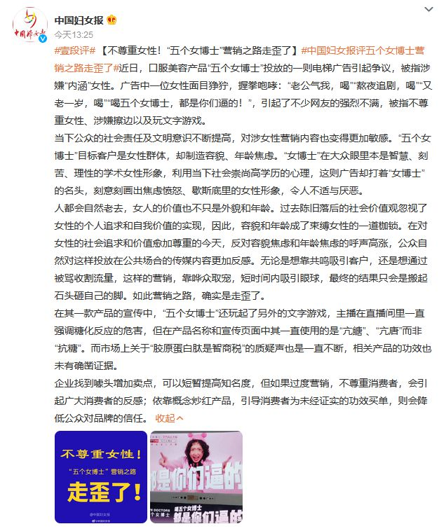2023年4月底,陸續(xù)有網(wǎng)友發(fā)帖曬出膠原蛋白飲料品牌“五個女博士”的廣告。廣告中“喝五個女博士,都是你們逼的!”等極具爭議的廣告詞,引起了不少網(wǎng)友的反感,隨后眾多媒體跟進(jìn)報道。