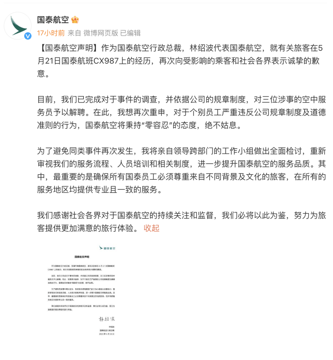 當(dāng)天晚間,國泰航空第三次發(fā)布聲明,國泰航空行政總裁林紹波代表國泰航空,就有關(guān)旅客在5月21日國泰航班某航班的經(jīng)歷,再次向受影響的乘客和社會各界表示誠摯的歉意。聲明稱,已完成對于事件的調(diào)查,并依據(jù)公司的規(guī)章制度,對三位涉事的空中服務(wù)員予以解聘。