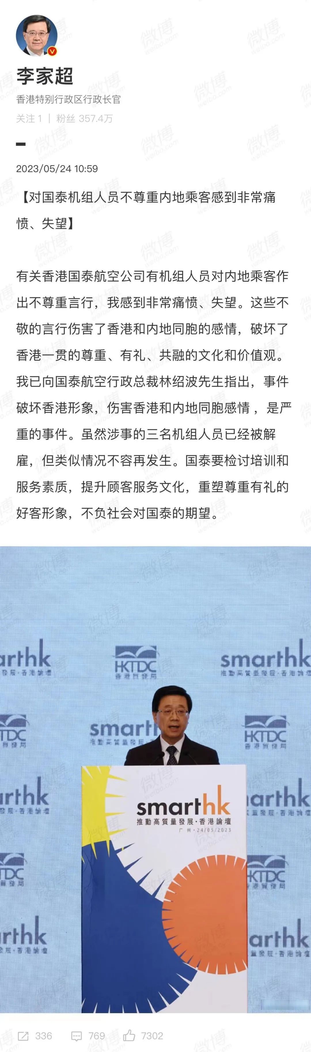 5月24日上午,香港特區(qū)行政長官李家超表示,對日前有關(guān)香港國泰航空公司機組人員對內(nèi)地乘客作出不尊重言行感到非常痛心,并要求國泰航空不能再發(fā)生類似情況。