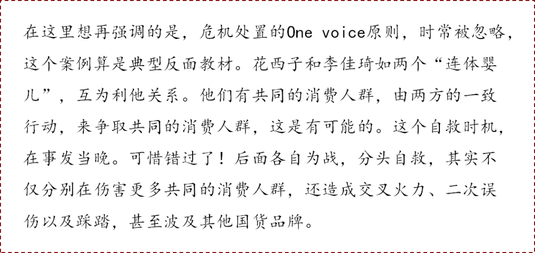 首席賦能官常說,公關(guān)思維和統(tǒng)戰(zhàn)思維是相通的,要“朋友多多的、敵人少少的”,要團(tuán)結(jié)一切可以團(tuán)結(jié)的力量。公關(guān)行動的底層工具是利益相關(guān)方。什么人群,關(guān)注、在意、忌諱什么?什么不能做、不能說,必須搞清楚!某種意義上這決定了危機會不會發(fā)生、影響程度嚴(yán)重不嚴(yán)重、處置策略能否準(zhǔn)確有效等整個體系。而花西子別說團(tuán)結(jié)更多力量了,連內(nèi)部的分歧都直接暴露于輿論炮火之下了,把自己人推向?qū)α⒚?,無異于“火上澆油”。