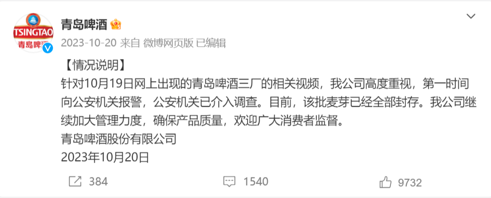 10月20日晚間,青島啤酒官方微博發(fā)布聲明回應(yīng)稱,針對10月19日網(wǎng)上出現(xiàn)的青島啤酒三廠的相關(guān)視頻,公司高度重視,第一時間向公安機關(guān)報警,公安機關(guān)已介入調(diào)查。目前,該批麥芽已經(jīng)全部封存。公司繼續(xù)加大管理力度,確保產(chǎn)品質(zhì)量,歡迎廣大消費者監(jiān)督。