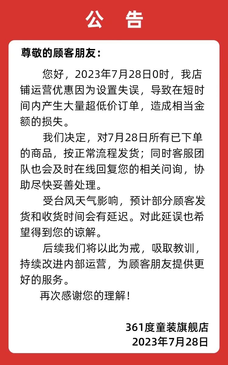對此,361度官方微博發(fā)布公告,表示將按照正常流程發(fā)貨所有異常訂單。公告中寫道:“尊敬的顧客朋友,您好,2023年7月28日0時,我店鋪運營優(yōu)惠因為設(shè)置失誤,導(dǎo)致在短時間內(nèi)產(chǎn)生大量超低價訂單,造成相當(dāng)金額的損失。我們決定,對7月28日所有已下單的商品,按正常流程發(fā)貨?!蓖瑫r,公告還表示,受臺風(fēng)天氣影響,預(yù)計部分顧客發(fā)貨和收貨時間會有延遲,希望消費者能夠理解。公告最后表示,將吸取此次教訓(xùn),持續(xù)改進(jìn)內(nèi)部運營,為消費者提供更好的服務(wù)。