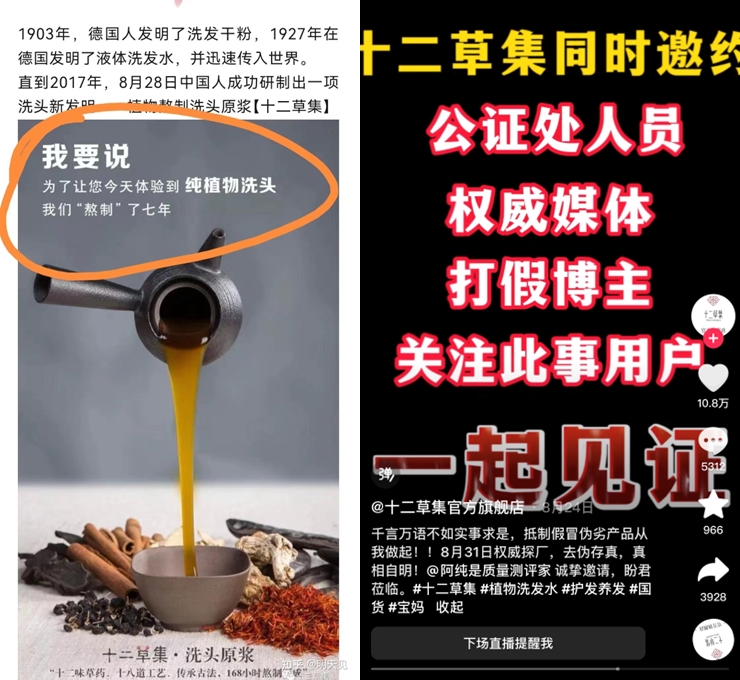 調(diào)研數(shù)據(jù)顯示,十二草集位列直播平臺2023年7月洗發(fā)水熱賣品牌榜單排名第二,超過海飛絲、清揚等大品牌。但是,該品牌洗發(fā)水很快就深陷輿論漩渦,“純植物”的配料表遭遇知名測評博主“打假”,指其實際產(chǎn)品檢出化學(xué)成分,與商家宣稱不符、涉嫌虛假宣傳。有消費者在投訴要求假一賠三,部分網(wǎng)友認(rèn)為,十二草集所稱的“生產(chǎn)中,有添加符合備案要求”,而宣傳中突出無添加,是侵害消費者知情權(quán)。