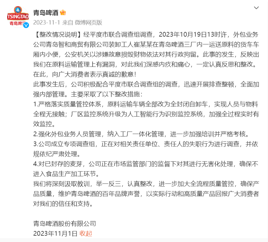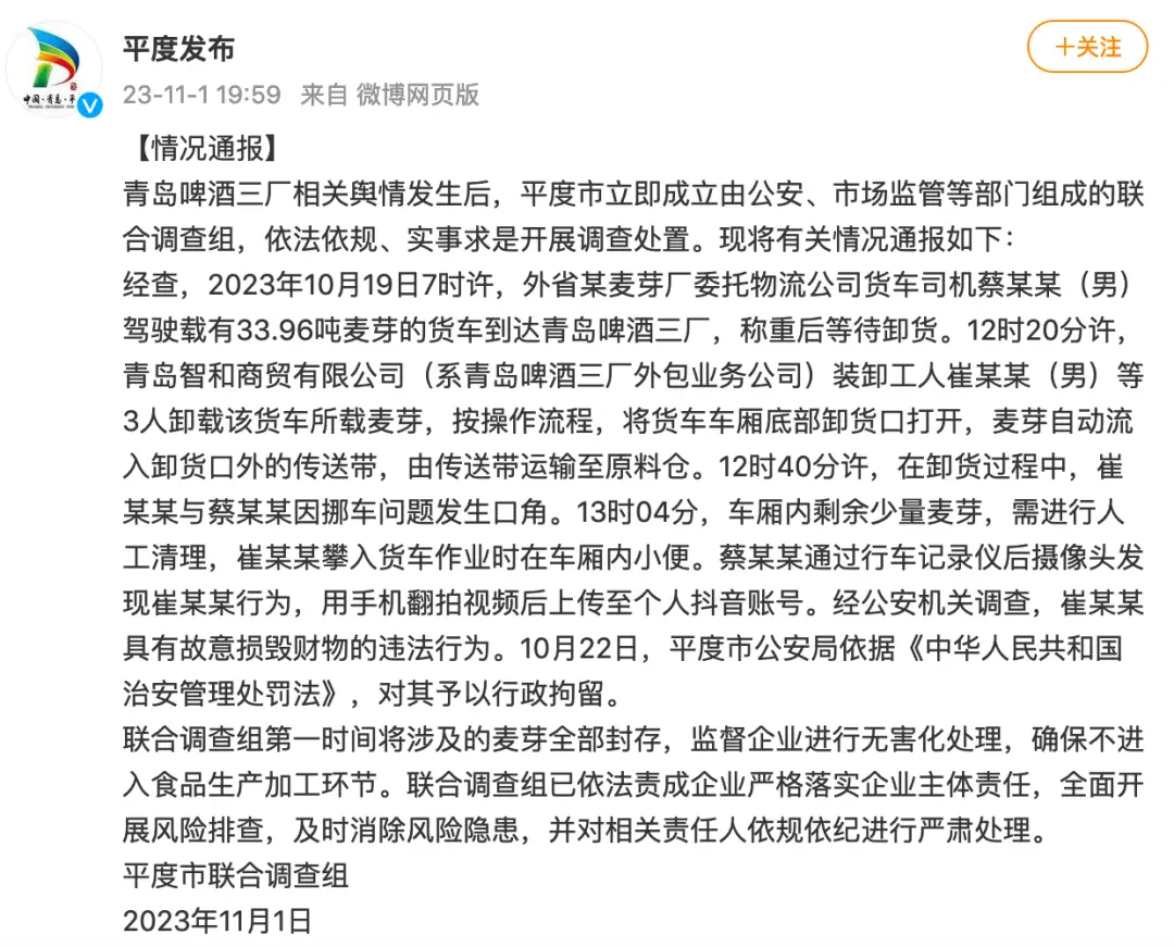 11月1日晚間,山東平度市聯(lián)合調(diào)查組發(fā)布通報稱,小便者是青島智和商貿(mào)有限公司(系青島啤酒三廠外包業(yè)務(wù)公司)裝卸工人崔某某。視頻記錄的內(nèi)容是,在貨車自動卸貨后,車廂內(nèi)剩余少量麥芽,需進(jìn)行人工清理,崔某某攀入貨車作業(yè)時在車廂內(nèi)小便。隨后,青島啤酒官方微博也發(fā)布整改情況說明,表示在原料運輸管理上有漏洞,并向廣大消費者致歉,“一定認(rèn)真反思和整改”,并附上調(diào)查組通報結(jié)果。此前,10月22日,平度市公安局已經(jīng)對崔某某予以行政拘留。