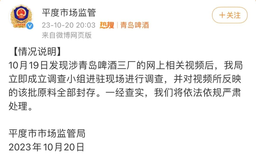 當(dāng)晚,山東省平度市市場監(jiān)督管理局也回應(yīng)稱,10月19日發(fā)現(xiàn)涉青島啤酒三廠的網(wǎng)上相關(guān)視頻后,該局立即成立調(diào)查小組進(jìn)駐現(xiàn)場進(jìn)行調(diào)查,并對視頻所反映的該批原料全部封存。