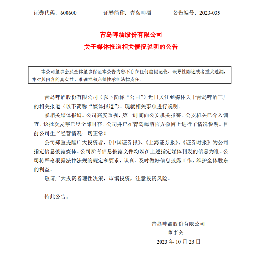 10月23日青島啤酒發(fā)布上市公司公告稱,近日關(guān)注到媒體關(guān)于青島啤酒三廠的相關(guān)報道,公司高度重視,第一時間向公安機關(guān)報警。公安機關(guān)已介入調(diào)查。該批次麥芽已經(jīng)全部封存。公司并已在青島啤酒官方微博上進(jìn)行了情況說明。目前公司生產(chǎn)經(jīng)營情況一切正常。
