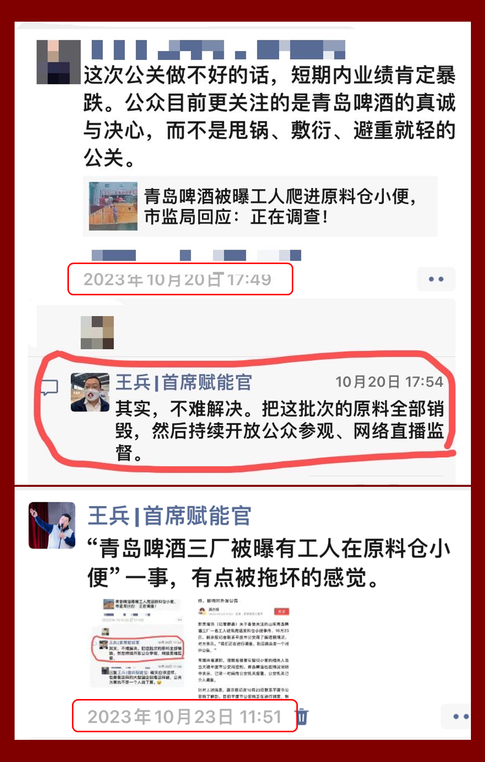“小便門”曝出后,引起網(wǎng)友熱議。在青島啤酒官方微博、青島啤酒東財(東方財富網(wǎng))股吧等平臺,有部分網(wǎng)友稱,近期不會再喝青島啤酒了,也有網(wǎng)友懷疑,背后或有力量故意炒作。